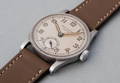 Elle présente un boîtier rond, un cadran émaillé blanc avec des chiffres romains noirs, des aiguilles en forme de feuille et un bracelet en cuir.