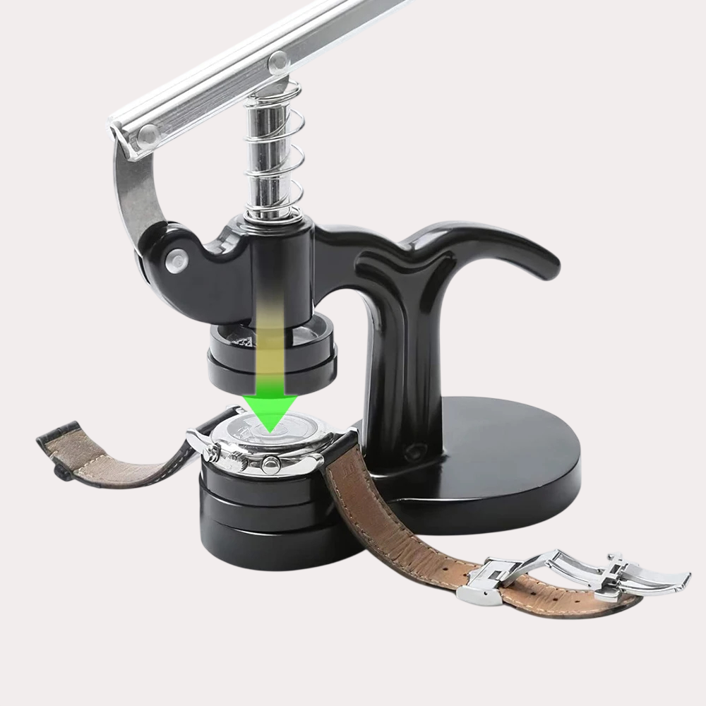 Le système de fermeture ergonomique rend l'opération accessible même aux débutants : sélectionnez les deux moules appropriés selon les dimensions de votre montre, vissez-les sur la presse, placez le tissu protecteur et actionnez le levier de pression.