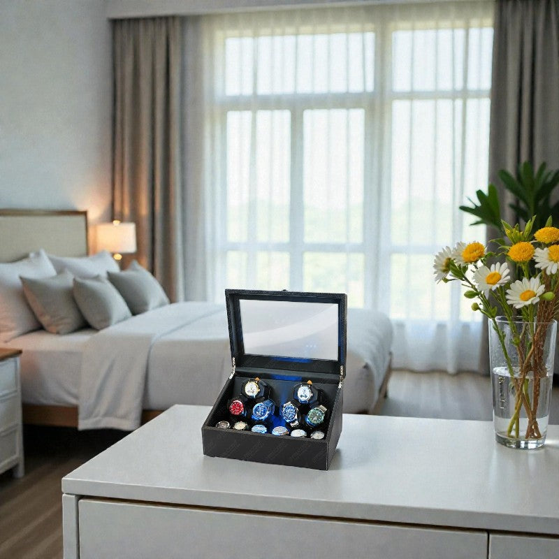 - Capacité totale : 6 montres en rotation + 6 en exposition statique